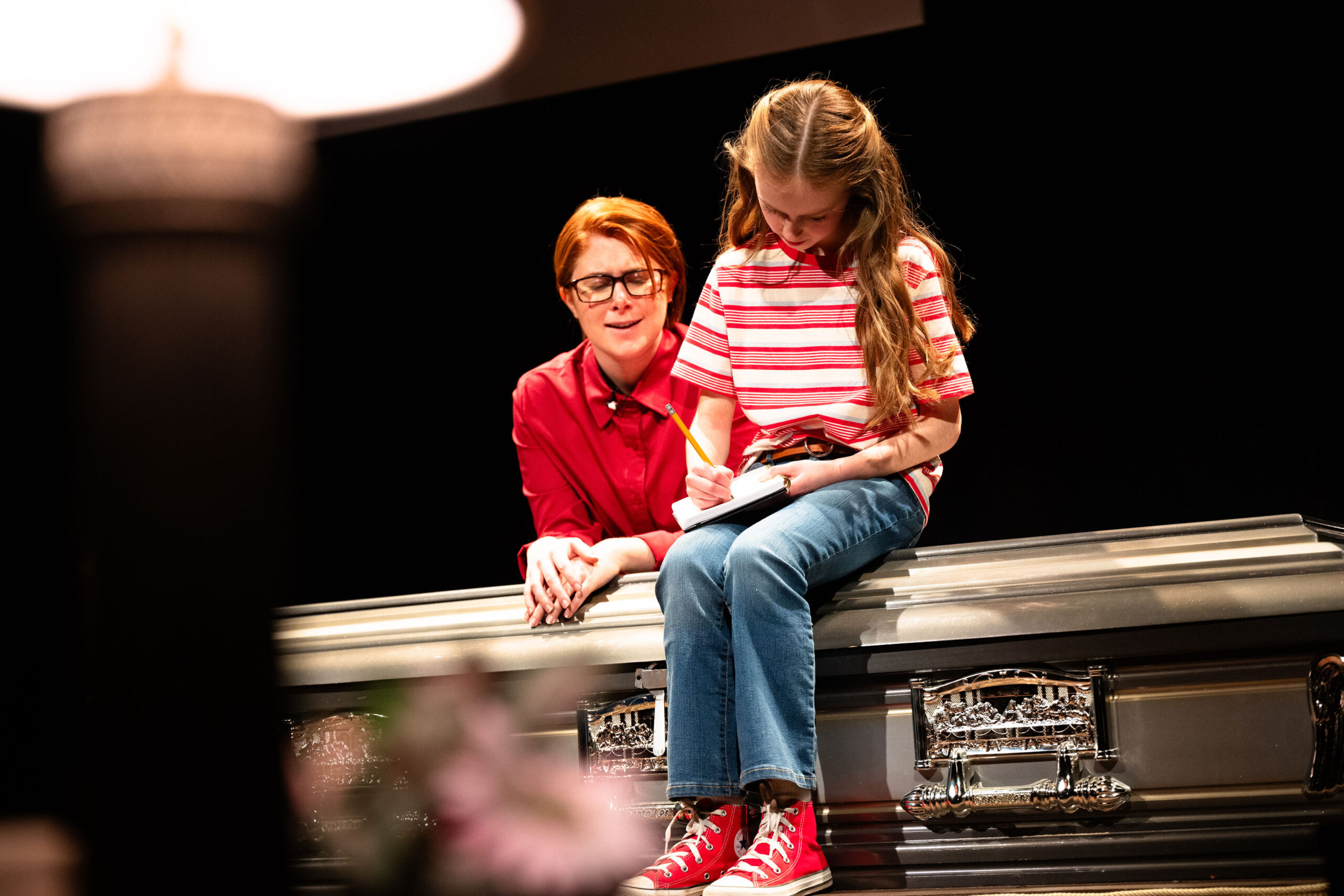 Accompanied by a live band and performed in the round, audience members see the cast up close. They follow along as adult Bechdel pieces together clues from her childhood that were there all along, realizing that she and her father were both gay and struggled with self-acceptance.