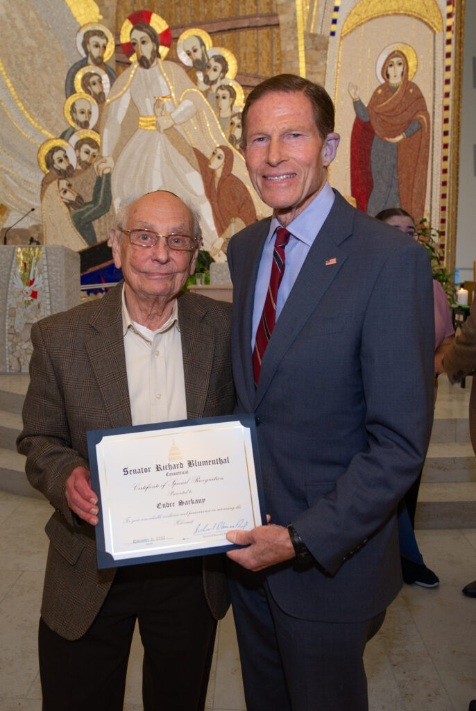 Senator Richard Blumenthal (right) presents Holocaust Survivor Endre Sarkany (left) with a Certificate of Special Recognition at the Annual Kristallnacht Commemoration.