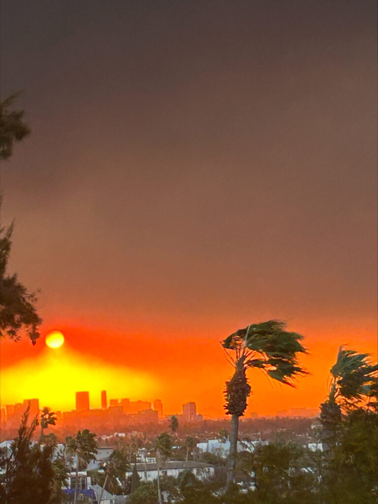 “7 a.m. on Wednesday morning [Jan. 8] while we were waiting for cabs to the airport, I’ll never forget the sun rising, highlighting the stark divide in the sky where the smoke was billowing from the Palisades with the clear blue skies in the East,” said Krebuszewski. “Looking back, I still can’t believe how quickly the fires spread and the devastation it has caused.”