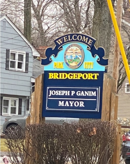 Sign welcoming people to Bridgeport, where there has been a recent string of car break-ins.