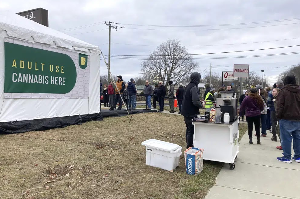 Contributed by AP News, Sue Haigh Customers wait in line to buy cannabis products at The Botanist in Montville, Conn.