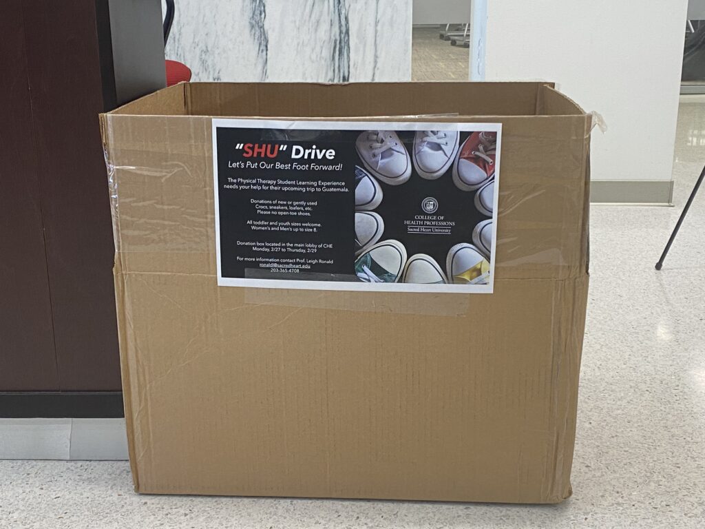 Over spring break, undergraduate and graduate students in the Physical Therapy (PT) program at Sacred Heart University traveled to Guatemala for a service trip. In preparation for the trip, a “SHU” Drive was held on Monday, Feb. 27 through Thursday, Feb. 29 where students were able to donate shoes to be given to the adults and children in need, on the trip.