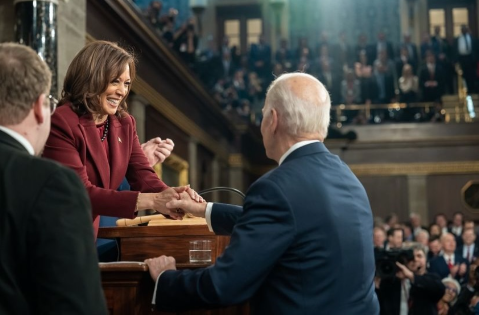 President Joe Biden shaking Vice President Kamala Harris’s hand at the State of the Union.