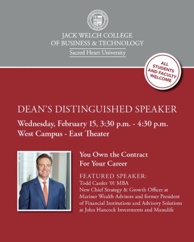 On Feb. 16, the Jack Welch College of Business and Technology (WCBT) hosted its Dean’s Distinguished Speaker Event at the East Theater on Sacred Heart University’s West Campus. They hosted Todd Cassler, whose presentation was titled “You Own the Contract For Your Career.”