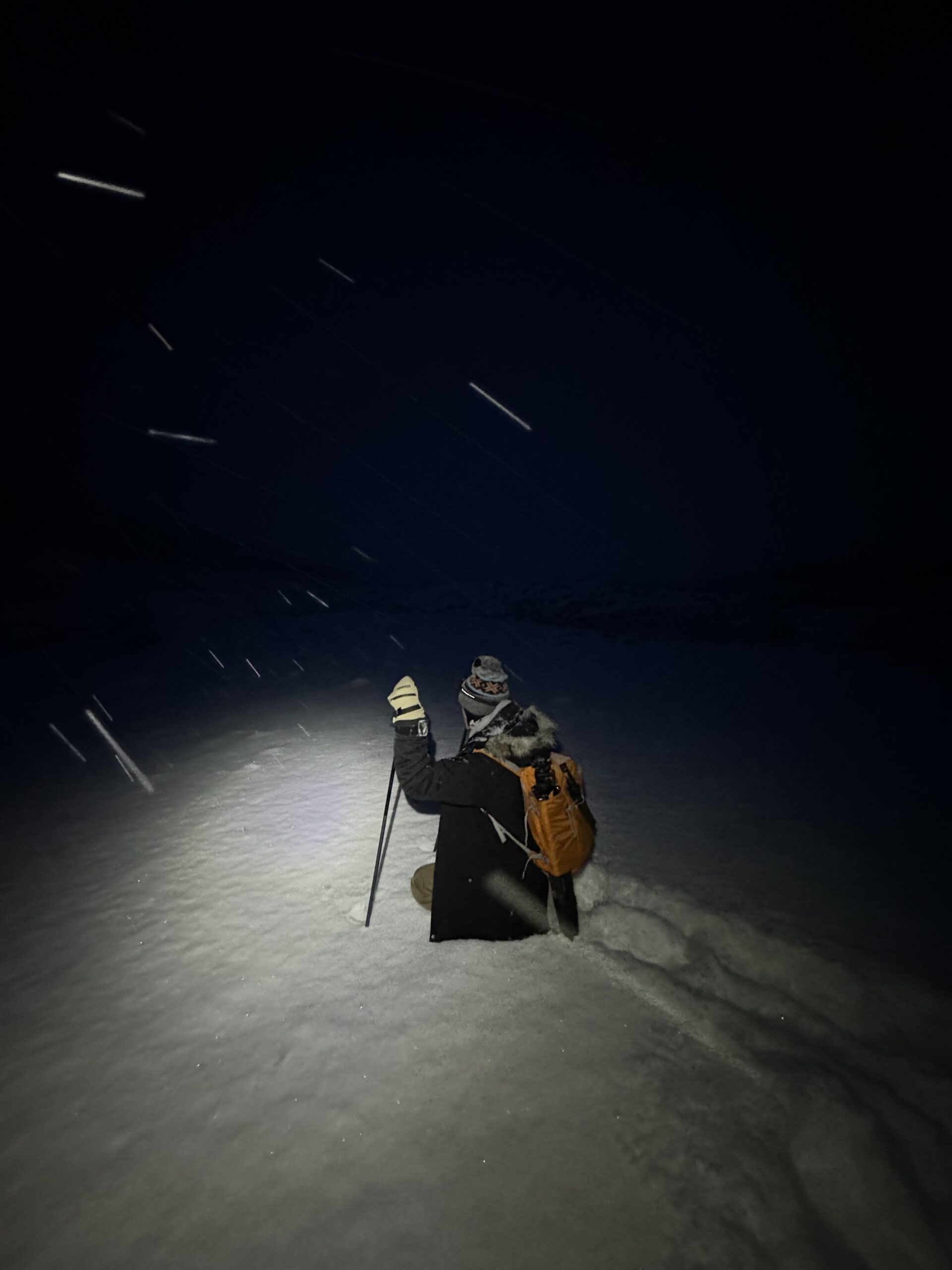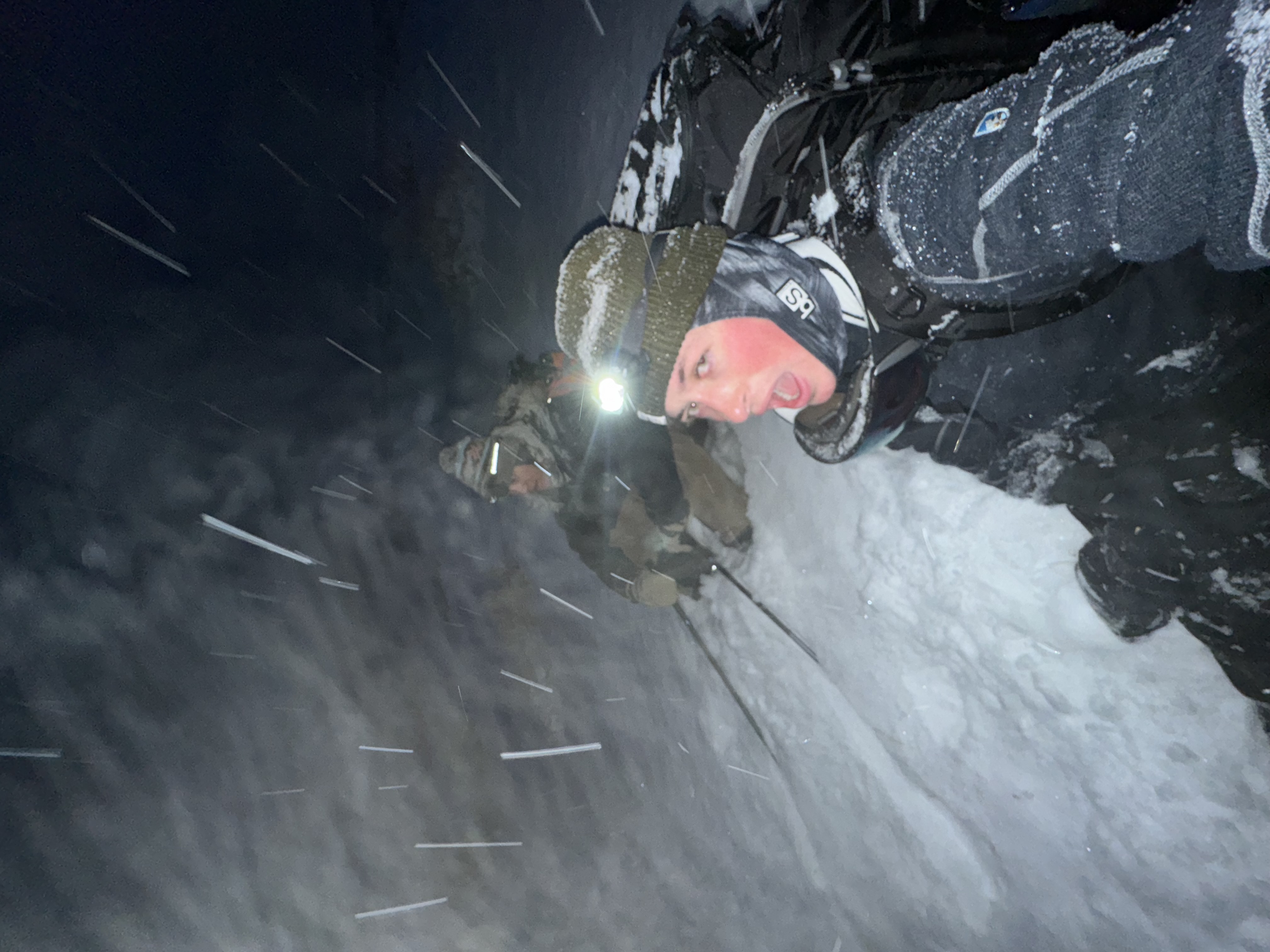 Carter using his headlamp and poles to discern the terrain in front of us.