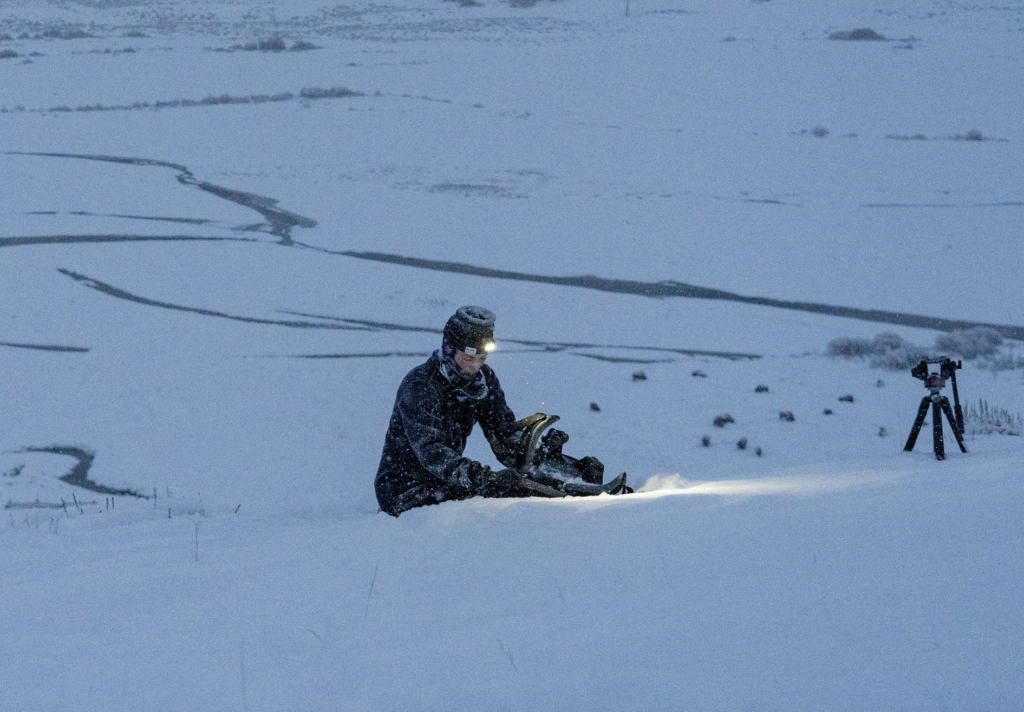 My friend and fellow cameraman Carter Johnson-Chen carried the brunt of the driving during our 4 a.m. journeys into Yellowstone. Once we were into the valley, it was time to gear up. Microspikes, trekking poles and headlamps were our best friends on these frigid mornings. Temperatures were consistently below 10 degrees and in many spots, we were moving through waist-deep snow.