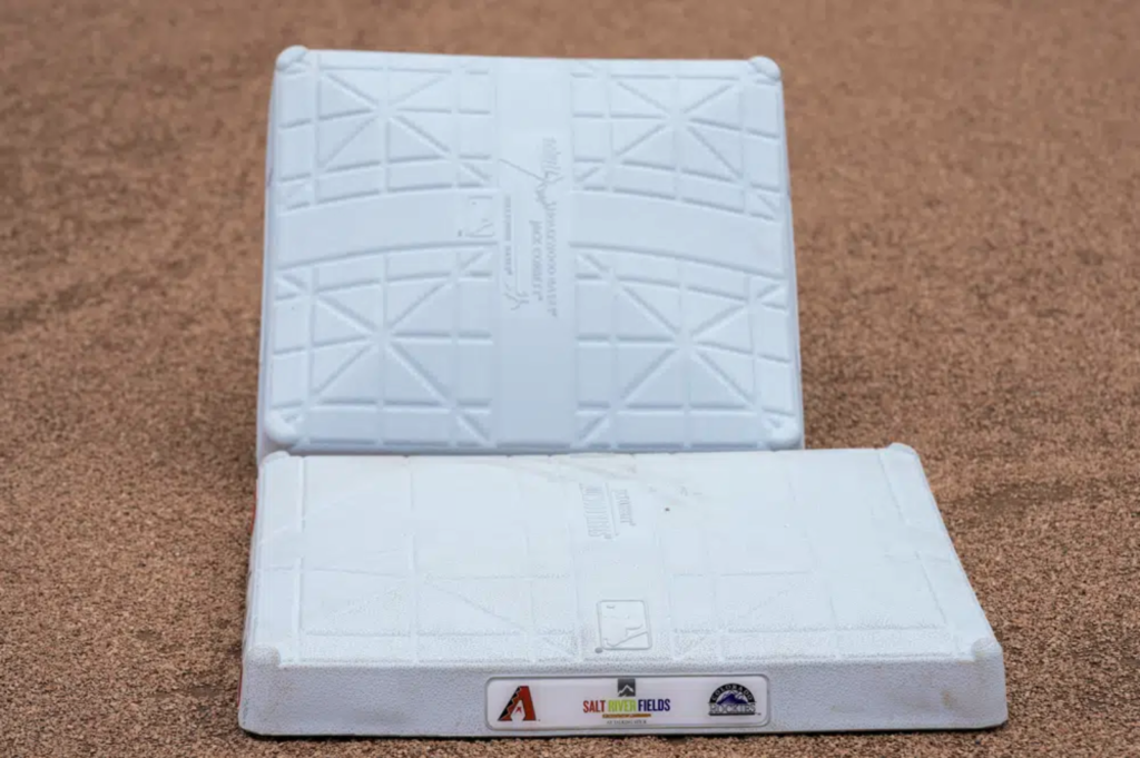 A new, larger base that is now standard with the MLB rule additions is seen next to an older, smaller base.