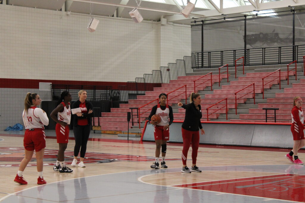 The Women’s Basketball team huddles during practice. Photo by Isabella Fabbo.