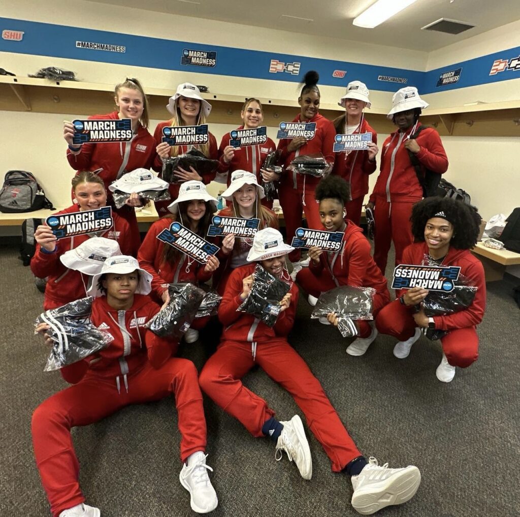 The SHU women’s basketball team posing with their March Madness gear in the locker room.